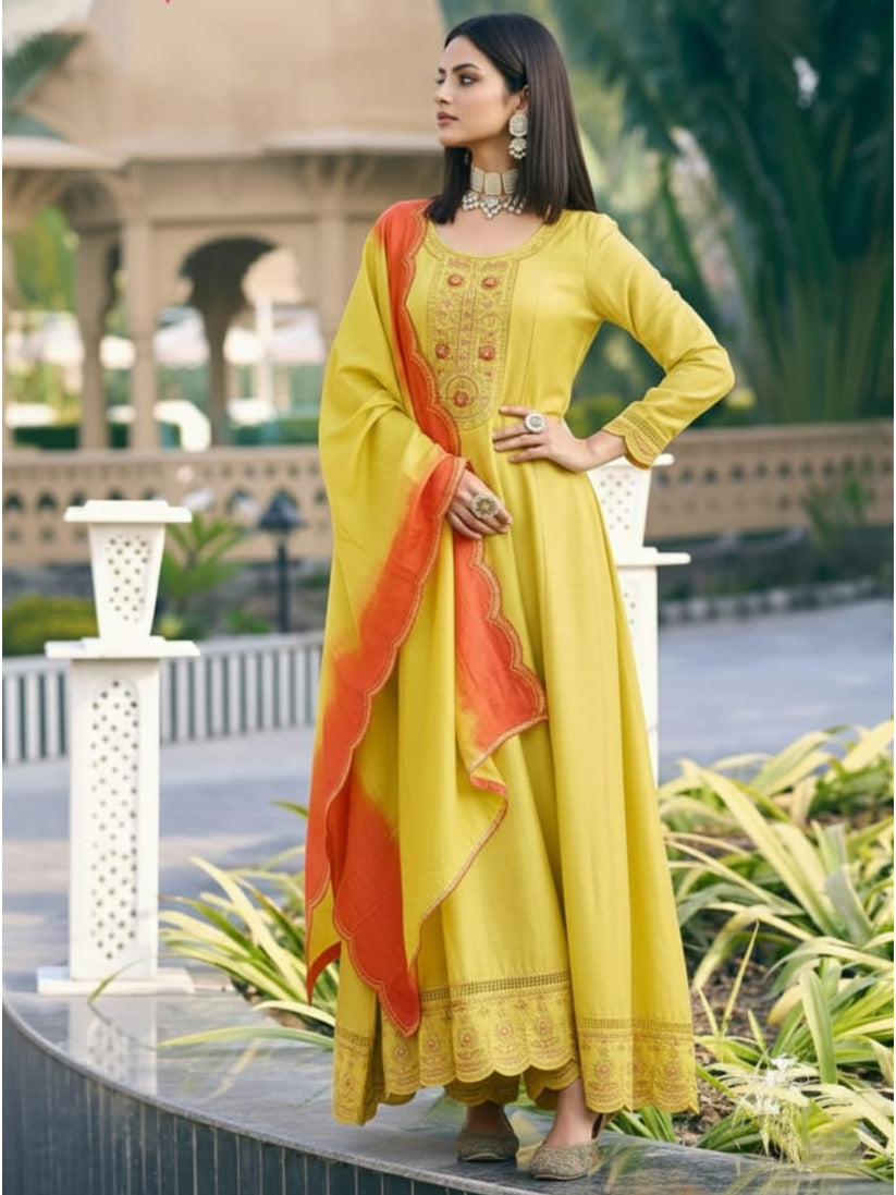 Celebrate in vibrant style with this Mustard Yellow Anarkali Suit from Ladies Smart Choice. Highlighted with traditional embroidery on the neckline and borders, this outfit radiates festive charm. The contrast dupatta adds richness, making it ideal for haldi ceremonies, festivals, and traditional gatherings.